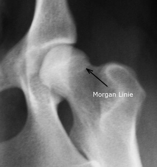 Eine Röntgenuntersuchung ist eine zuverlässige Möglichkeit, den Schwerengrad (es gibt 5 Schweregrade) der Erkrankung zu erkennen. Die Gelenke müssen Übersteckt werden, was beim Vorliegen einer HD starke Schmerzen verursacht. Da die Gelenke dabei stark überstreckt werden, muss sie unter eine Kurznarkose durchgeführt werden. Eine Vorraussetzung für eine aussagekräftige Diagnose ist die exakte Positionierung des Tieres in der Rückenlage mit gestreckten, paralell gelagerten Oberschenkeln und einem rechtwinkligen zum Strahlengang eingedrehten Kniescheiben. Zusätzliche Aufnahmen können in "Froschhaltung" der Oberschenkel oder seitlichen Strahlenhang erfolgen. Ein wesentliches Auswertungskriterium ist der Norberg-Winkel. Der Norberg-Winkel ist als der Winkel definiert, der zwischen der Verbindungslinie der Zentren der beiden Oberschenkelköpfe und dem vorderen Pfannenrand abgetragen wird. Mehr als 150° sollte er bei einem HD-freien Tier betragen. Weitere Beurteilungskriterien sind die Kongruenz von Oberschenkelkopf und Gelenkpfanne, die Weite des Gelenkspaltes, die Pfannenkontur, die Kontur des Oberschenkelkopfes sowie das Vorhandensein von Hinweisen auf arthrotische Prozesse wie walzenförmige Verdickungen des Oberschenkelhalses, Randwülste an der Gelenkpfanne, unter dem Knorpel befindliche Verdichtungen der Knochensubstanz im Pfannenbereich und die Anlagerung von Knochenmaterial 8 Osteophyt) am Ansatz der Gelenkkapsel (Morgan-Linie). Die Morgan-Linie ist ein sensitiver Frühmarker für eine Instabilität im Hüftgelenk. Für die züchterische Auswertung von HD-Aufnahmen ist im VDH nur durch von den Rassezuchtverbänden zugelassene Gutachter möglich, an die der Tierarzt die Röntgenbilder schicken muss.